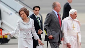 Madrid, 18 de agosto.- Tras los incidentes de Puerta del Sol, el Sumo Pontífice llegó al aeropuerto de Barajas para encabezar la Jornada Mundial de la Juventud. Fue recibido por el presidente Rodríguez Zapatero y el rey Juan Carlos.