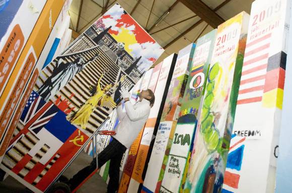 A iniciativa del Instituto Goethe, el millar de piezas del dominó gigante sirvieron de lienzo para que unos 15.000 escolares alemanes y una veintena de artistas de países como México, China y los territorios palestinos plasmaran pictóricamente su experiencia de vivir en un país en el que pervive la división. Las piezas, de unos veinte kilogramos cada una, serán ubicadas siguiendo las huellas del antiguo muro el próximo 7 de noviembre y podrán visitarse hasta dos días, después que culmine la "Fiesta de la Libertad".
