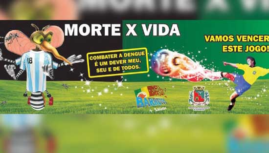En uno de los modelos de los carteles en vía pública, la municipalidad de Barretos muestra a un jugador con la camiseta de la selección de fútbol brasileña pateando una pelota con la frase "vamos a ganar este partido". Al lado está el mosquito trasmisor de la enfermedad con la camiseta de argentina, histórico rival en el fútbol, que vuela bajo la palabra "muerte".