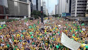 Brasil, 16 de marzo.- Vestidos de verde y amarillos, un millón y medio de manifestantes coparon las calles de las principales ciudades de Brasil, como Río de Janeiro, Recife, Salvador y Brasilia, donde unas 50.000 personas avanzaron hacia el Congreso, aunque la mayor convocatoria fue en la gigantesca ciudad de San Pablo. De acuerdo con datos brindados por la Policía, participó un total de 1,5 millones de personas en 65 ciudades.