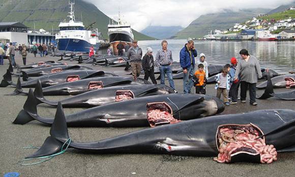 Buenos Aires, 30 de julio.- Los cadáveres destripados de las ballenas piloto o más conocidas como Calderón sacrificadas brutalmente fueron fotografiadas en el muelle tras se masacradas a machetazos con cuchillos y ganchos afilados por los pescadores en las Islas Feroe, Dinamarca.