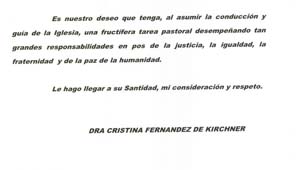En un escueto escrito, la mandataria expresó: “en mi nombre, en nombre del Gobierno argentino y en representación del pueblo de nuestro país, quiero saludarlo y expresarle mis felicitaciones con ocasión de haber resultado elegido como nuevo Romano Pontífice de la iglesia Universal”.