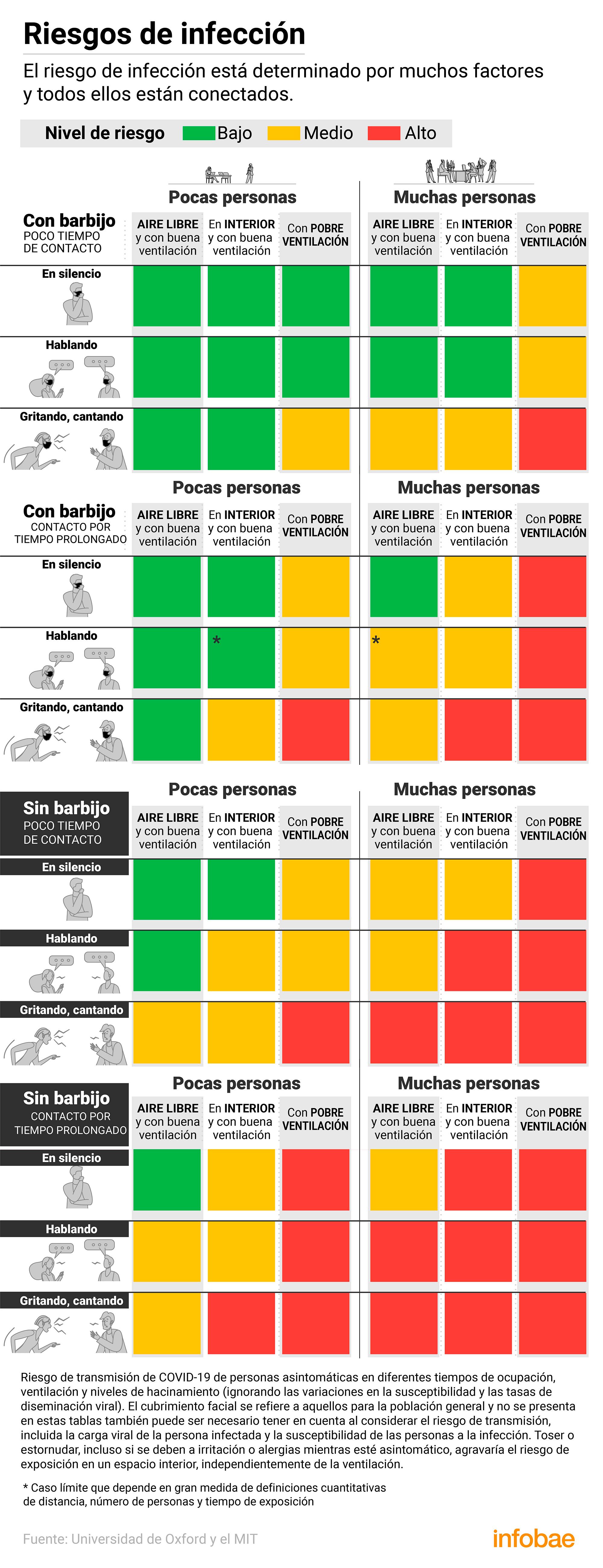 “El riesgo de infección está determinado por muchos factores y todos ellos están conectados. Aún no hay ningún estudio que determine el riesgo absoluto, pero queremos empoderar a la gente para que evalúe el riesgo relativo a cada situación”. Lydia Bourouiba es investigadora y una de las autoras del estudio publicado por la Universidad de Oxford y el Massachussetts Institute of Technology (MIT), en el que desarrollaron una tabla que ayuda a la gente a conocer y medir el riesgo de contagio cada vez que acuden a una reunión social.