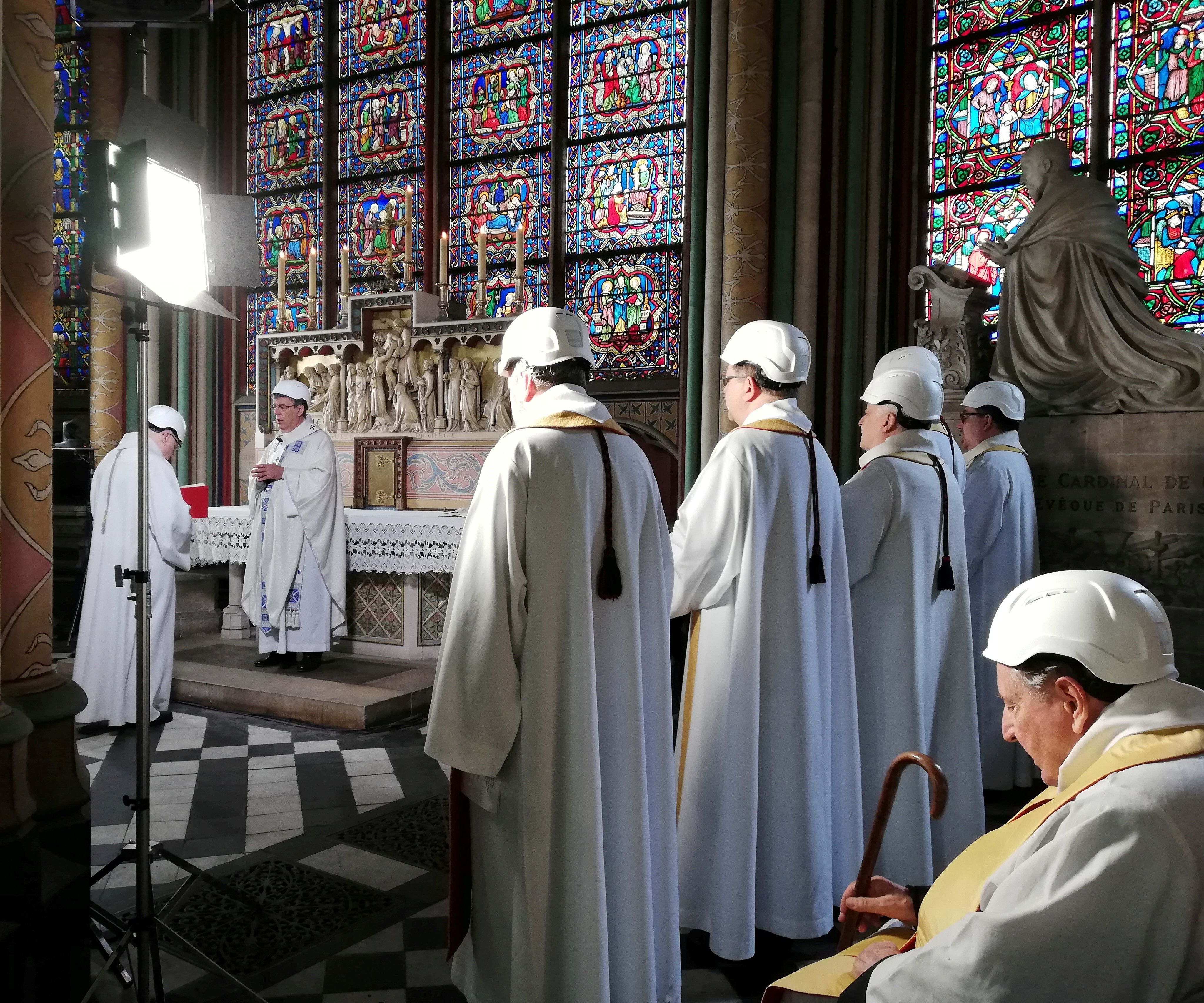 Como una muestra del estado en que quedó la Catedral, el arzobispo de París (Francia), Michel Aupetit, ofició la misa con un casco blanco. "La catedral sigue viva", dijo Aupetit, al comienzo de la ceremonia en la que se recuerda la fiesta de la Dedicatoria, una de las más importantes para Notre Dame ya que se festeja su inauguración religiosa.
