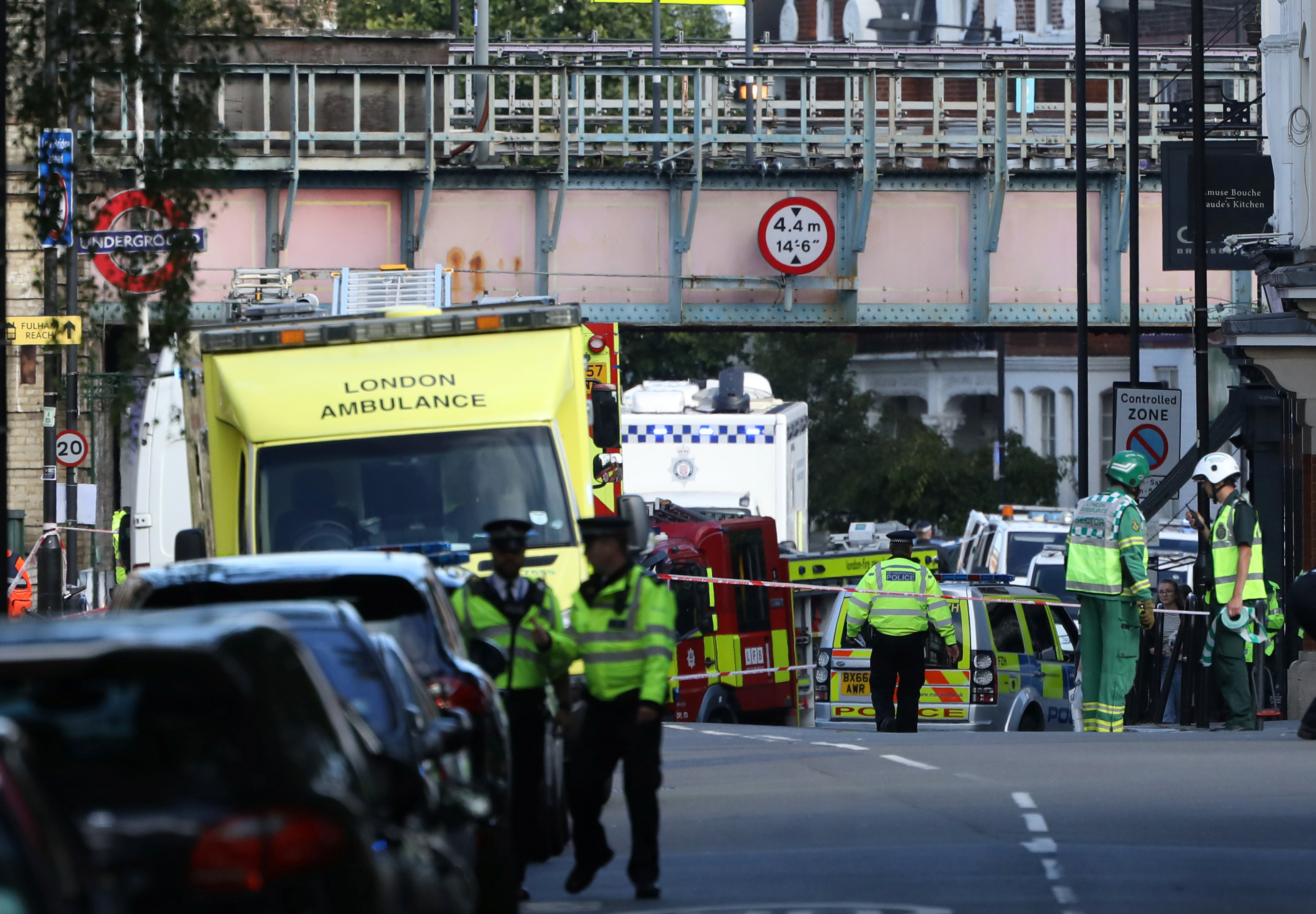 Entre ambulancias. Efectivos policiales, bomberos y ambulancias en la zona de la explosión, cerca de la estación de Parsons Green de la línea Disctrict Line.