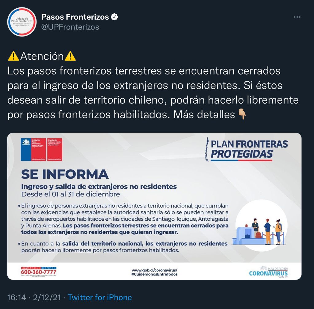 Debido a la aparición de Ómicron, la nueva variante del coronavirus, las autoridades de Chile decidieron posponer la apertura de algunos de sus pasos terrestres y prohibir el ingreso de extrajeron no residentes.