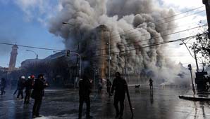 Varios encapuchados quemaron una farmacia y un supermercado en el centro de Valparaíso, y las televisoras locales emitieron imágenes de edificios de los que salían nubes de humo visibles desde varios puntos de la ciudad. Un hombre identificado como Eduardo Lara fue hospitalizado con asfixia y falleció. El portavoz del gobierno,Marcelo Díaz, condenó el hecho en declaraciones a la televisora TVN.