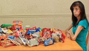 A pesar de no tener ni un solo gramo de grasa corporal, Lizzie no puede hacer una vida normal. Come con frecuencia para mantenerse en pie con fuerzas, pero jamás aumenta su peso. En total, llega a ingerir hasta 8.000 calorías diarias.