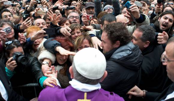Antes de entrar en la pequeña iglesia, Francisco se paró a saludar a la gente que había guardado cola en el exterior de una puerta cercana del Vaticano y que gritaban ‘Francesco, Francesco, Francesco‘, su nombre en italiano.