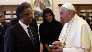 El presidente de Madagascar regaló al Papa una pequeña cruz pectoral de oro y el Pontífice le entregó un objeto de bronce, con la vista del proyecto original de la basílica vaticana y una copia de su exhortación apostólica "Evangelli gaudium".
