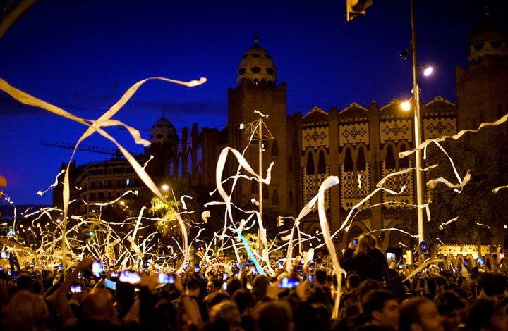 Oscurecía este miércoles en La Monumental, la antigua plaza de toros de Barcelona, cuando una lluvia de serpentinas blancas arrojadas por cientos de independentistas catalanes cruzó el cielo como estrellas fugaces.
