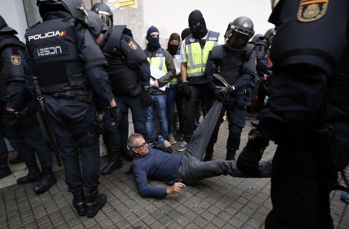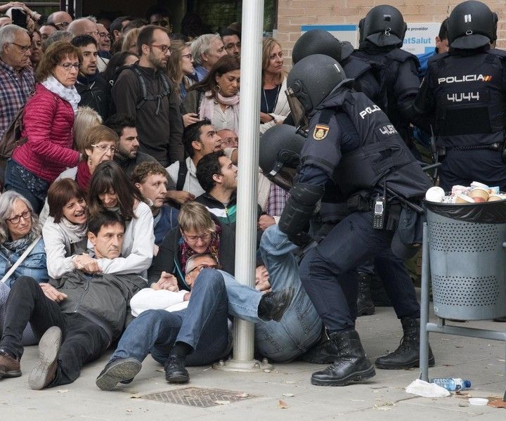 La violencia estalló a las 9 de la mañana en decenas de colegios de Cataluña cuando las fuerzas de seguridad española irrumpieron para secuestrar urnas y desalojar a quienes se agolpaban desde la madrugada para votar en el referéndum independentista convocado por el gobierno regional.