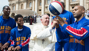 Vaticano, 6 de mayo.- Los Globetrotters entregaron al papa una camiseta enmarcada con el número 90 y el nombre "Pope Francis", y le pidieron que jugara con ellos.