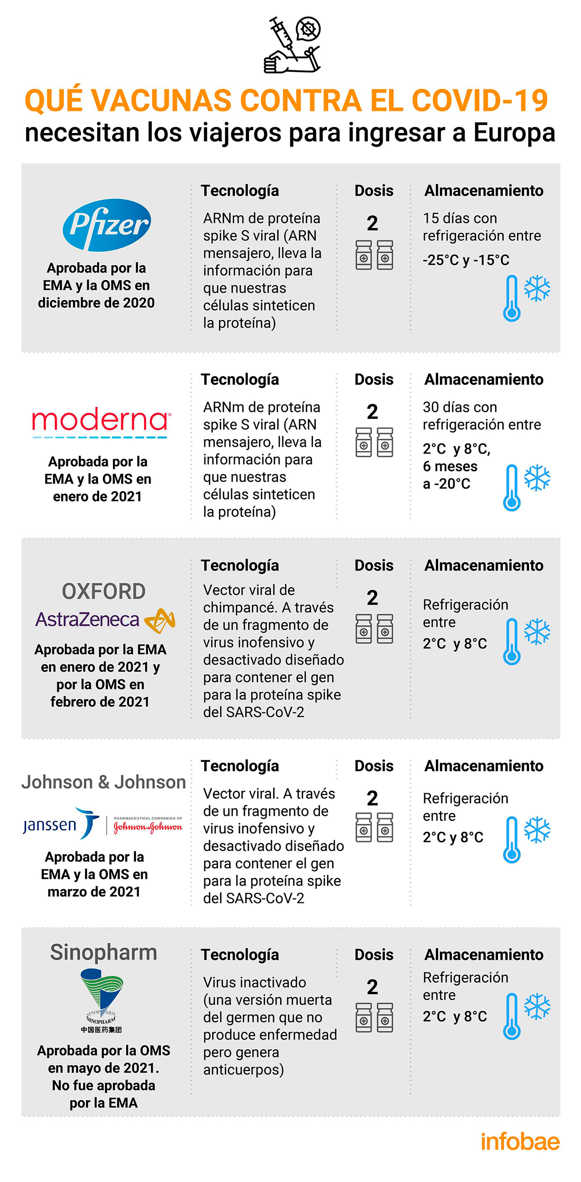 Así, la lista se reduce a Pfizer, Moderna, AstraZeneca, Johnson & Johnson y Sinopharm. Claro que, según confirmaron las autoridades europeas, la nómina se irá ampliando a medida que la EMA y la OMS autoricen más vacunas.