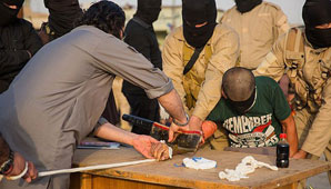 Los terroristas están cubiertos con pasamontañas negros y vestidos con un uniforme de camuflaje. Para la amputación utilizaron un cuchillo de carnicero.