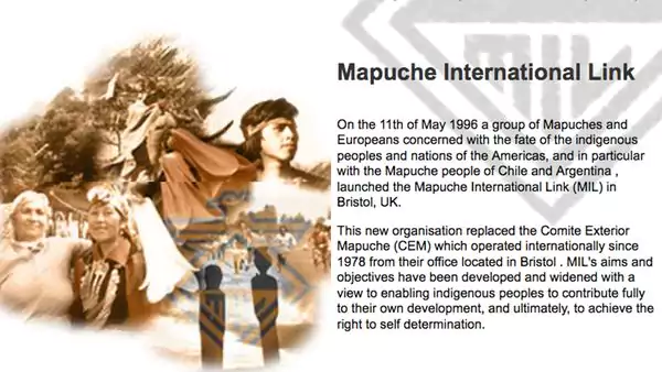 "El día 11 de mayo de 1996, un grupo de mapuches y europeos comprometidos con el destino de los pueblos y naciones indígenas de las Américas, y en particular con el pueblo mapuche de Chile y Argentina, lanzaron la Mapuche International Link (MIL) en Bristol, United Kingdom", explican las autoridades de esta organización; a saber, Edward James (Relaciones Públicas), Colette Linehan (administradora), Madeline Stanley (coordinadora de Voluntarios),  Fiona Waters (a cargo del equipo de Derechos Humanos), entre otros.
