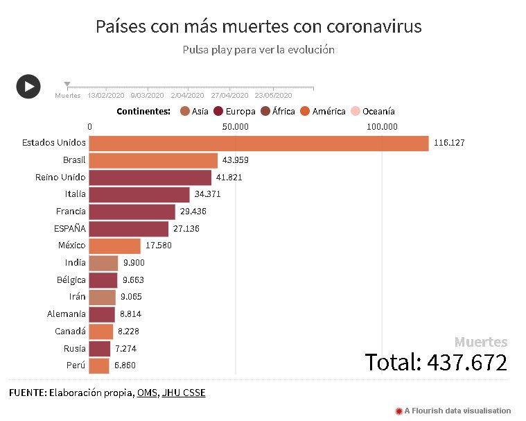 Estos países han adelantado a China, el epicentro original donde surgió la pandemia en diciembre de 2019, aunque ahora el foco principal de la pandemia ha viajado de Europa a América, que es ya el continente con más casos de Covid-19.