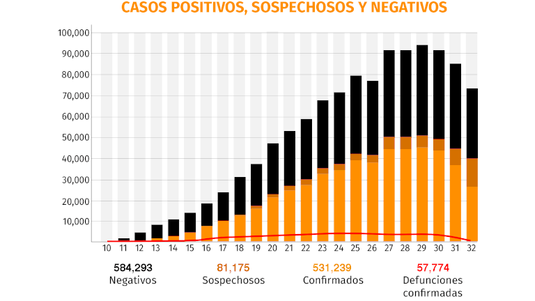 México ya suma 531,239 contagios confirmados de Covid-19, mientras que la cifra de decesos por esta enfermedad ascendió a 57,774, de acuerdo con el informe técnico más reciente presentado por José luis Alomía, director de Epidemiología de la Secretaría de Salud.