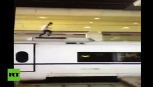 Diario de Cuyo | HOME | Mundo | China Corrió por el techo de un tren, tocó un cable y se electrocutó En la ciudad china de Guangzhou, un hombre murió luego de toparse con un cable de alta tensión mientras corría por el techo de un tren eléctrico. Video. Por Redacción Diario de Cuyo 04/05/2016 · 0:00 Ver los comentarios ›