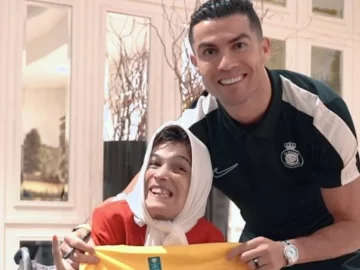 El delantero portugués del Al Nassr de Arabia Saudita abrazó a la pintora iraní Fátima Hamami como agradecimiento por regalarle un cuadro. Según la ley iraní, “tocar a la mujer no casada equivale a adulterio.”