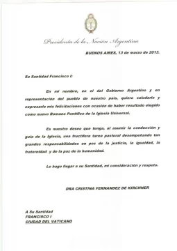 ‘En mi nombre, en el del Gobierno Argentino y en representación del pueblo de nuestro país, quiero saludarlo y expresarle mis felicitaciones con ocasión de haber resultado elegido como Nuevo Romano Pontífice de la Iglesia Universal.