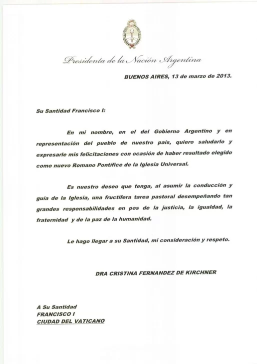 Precisamente, a poco de conocerse la designación de Bergoglio, a través de una carta oficial, la mandataria le expresó a Francisco I que ‘es nuestro deseo que tenga, al asumir la conducción y guía de la Iglesia, una fructífera tarea pastoral desempeñando tan grandes responsabilidades en pos de la justicia, la igualdad, la fraternidad y de la paz de la humanidad‘.