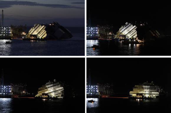 El Costa Concordia, el gigantesco crucero que el 13 de enero de 2012 naufragaba causando la muerte de 32 personas, fue enderezado en la madrugada italiana de ayer. Ahora, la mayor preocupación por el crucero, que estaba encallado en la isla italiana de Giglio, se concentra en el lado estribor del casco ya que, aunque no hay fracturas, se encuentra bastante deformado y esto añadirá dificultad a la instalación de los 15 flotadores-estabilizadores que servirán para reflotar el barco. Cuando ya estén instalados, y aún no se han dado fechas, se dará el empuje para trasladar el barco.