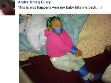 Estados Unidos, 21 de diciembre.- André Curry, de 21 años, publicó una foto en la red social Facebook, donde mostraba a su pequeña hija atada de pies y manos y con la boca tapada con cinta adhesiva.