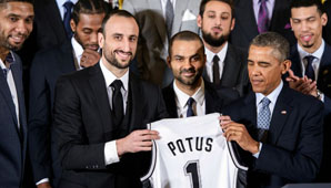 El argentino Emanuel Ginóbili, ya histórico jugador del conjunto texano, fue el encargado de obsequiarle a Obama una camiseta del equipo con el número 1 y la sigla "POTUS", por "President Of The United States" (presidente de los Estados Unidos, en español).