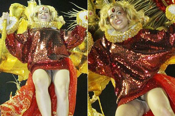 Además de mostrar sus polémicas piernas, la joven, que vestía minúscula ropa interior, dejó a la muestra parte de sus intimidades para algunos fotógrafos que estratégicamente la enfocaron desde el piso cuando daba sus pasos de samba.