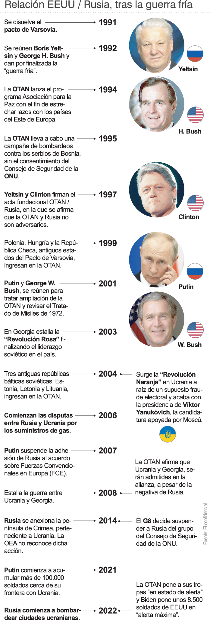 Desde la Casa Blanca, el mandatario afirmó que ahora mismo hay "una ruptura completa" en las relaciones entre Estados Unidos y Rusia, aunque, preguntado por si el mundo vive una nueva Guerra Fría, dijo que "depende". "La vasta mayoría del mundo está en oposición total a lo que está haciendo (Putin), desde Asia a Sudamérica, pasando por Europa y el resto del mundo; va a ser un día frío para Rusia, no hay mucha gente que esté saliendo a defenderlo", indicó.