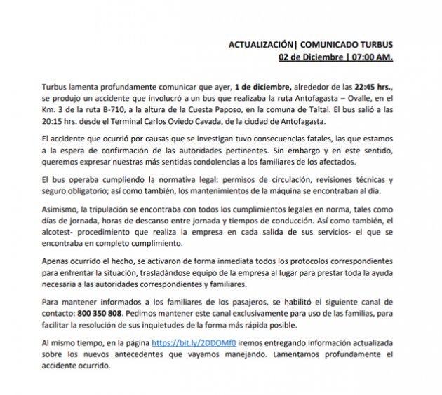 La empresa a través de Twitter, mencionó que este bus realizaba la ruta Antofagasta – Ovalle, y el accidente ocurrió a la altura de la Cuesta Paposo en Taltal, por causas que aún se investigan.