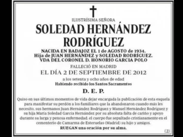 "Ilustrísima señora Soledad Hernández Rodríguez, nacida en Badajoz el 1 de agosto de 1934, hija de Juan Hernández y Soledad Rodríguez, viuda del coronel D. Honorio García Polo, falleció en Madrid el día 2 de septiembre de 2012, a los setenta y ocho años de edad, habiendo recibido los Santos Sacramentos. Descanse en Paz".