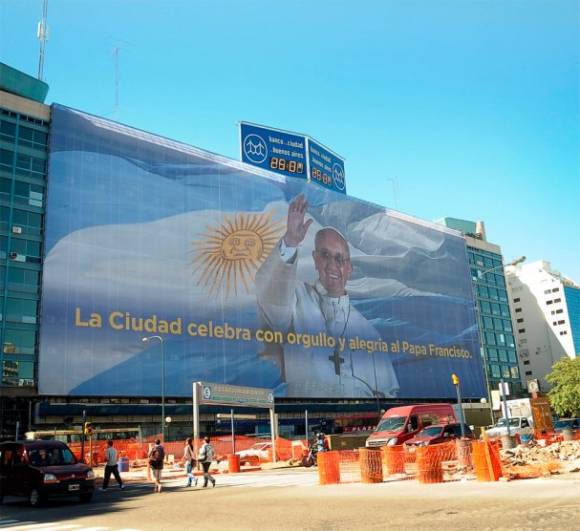 "La ciudad celebra con orgullo y alegría al Papa Francisco", dice el mural instalado esta mañana en el edificio ubicado en la intersección de las calles Pellegrini y Sarmiento, a pocos metros de la Avenida 9 de Julio.