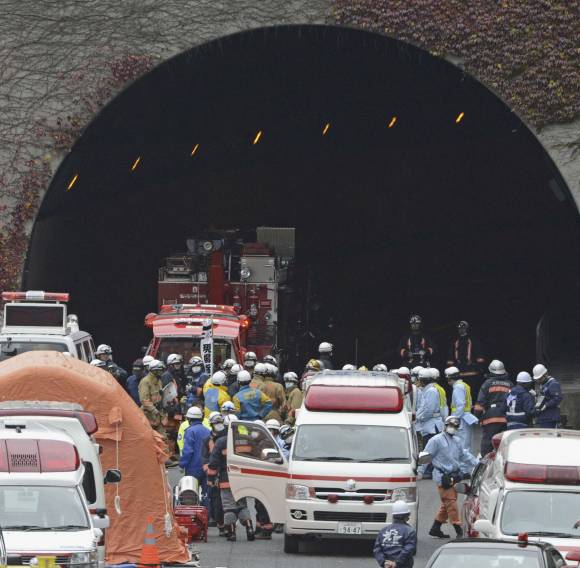 Un tramo de la parte superior del túnel de Sasago, de 4,7 kilómetros y situado a unos 80 kilómetros de Tokio, se desplomó por causas que todavía se desconocen y dejó tres vehículos atrapados, entre ellos una furgoneta.