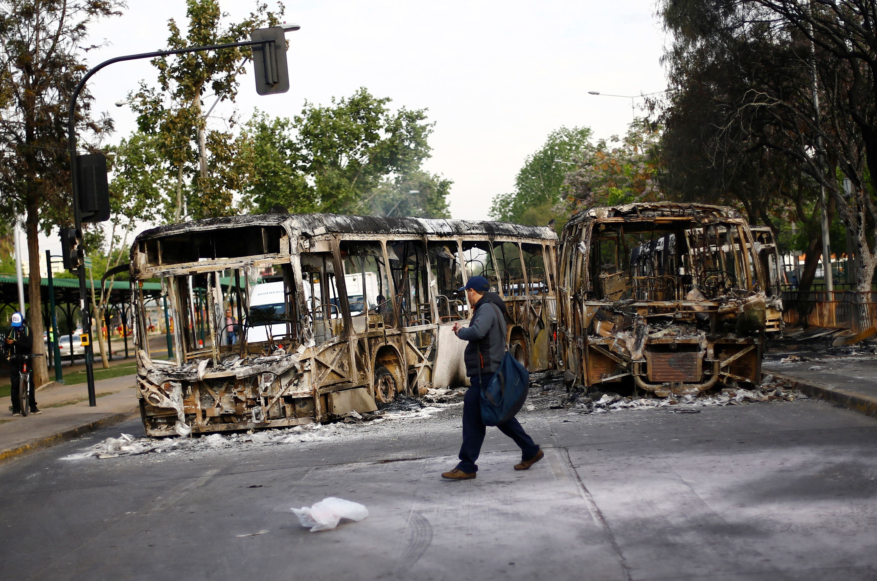 Incendiados. Un vecino de Santiago camina frente a dos colectivos incendiados en la capital chilena, que está teniendo horas agitadas por las protestas.