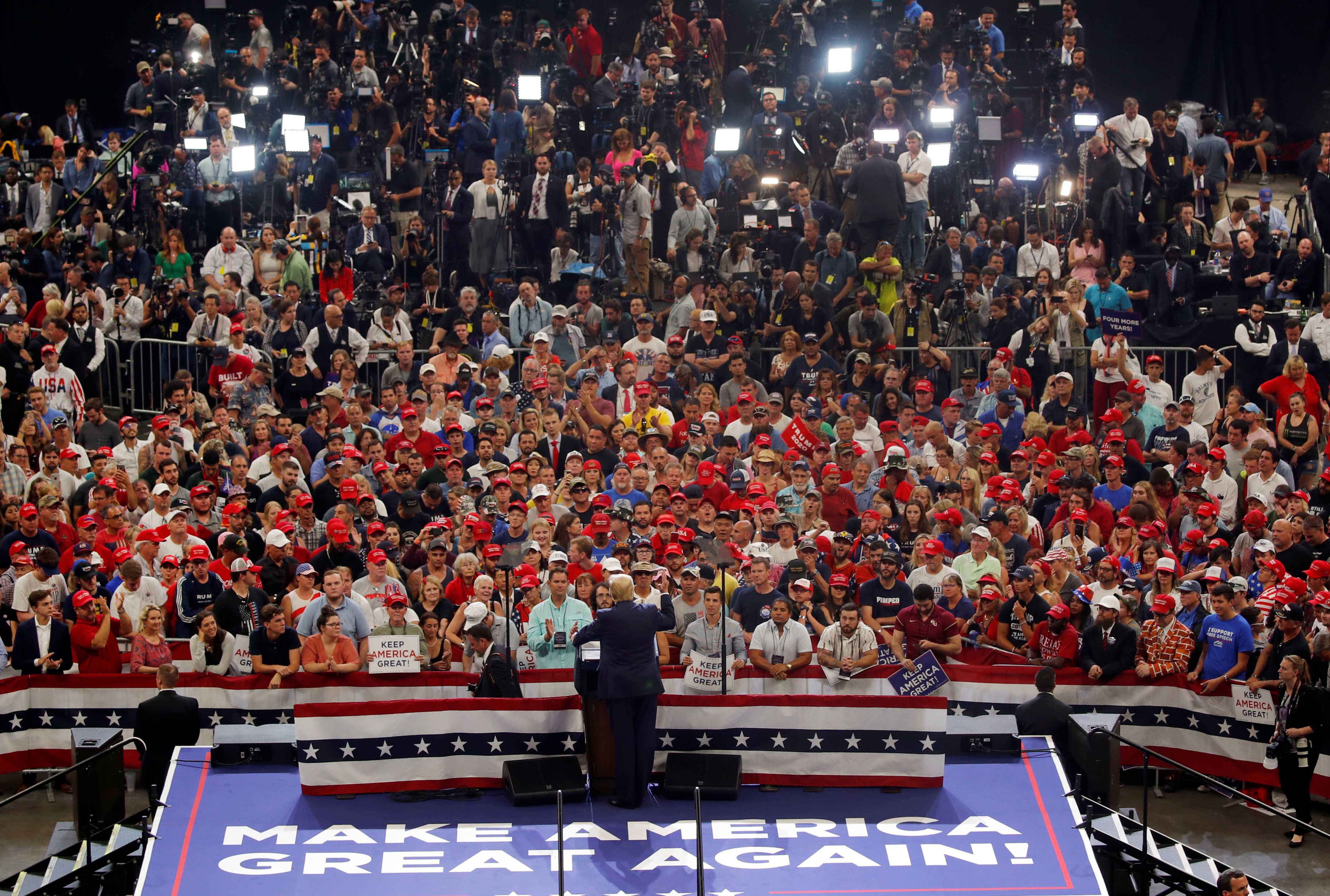 A pesar del calor intenso, la humedad y las lluvias, desde temprano un mar de gorros con la leyenda Make America Great Again comenzó a moverse hacia el interior del estadio, al son de "My Heart Will Go On", de Celine Dion, "We Are The Champions", de Queen, y "Macho Man" de Village People.