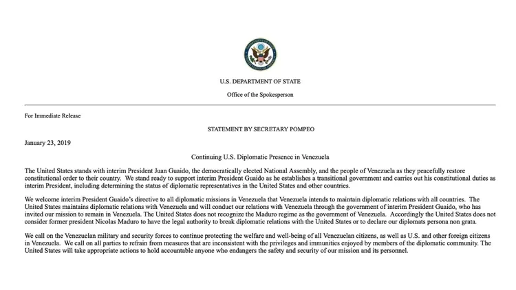 Por medio de un comunicado, el Departamento de Estado reiteró su reconocimiento a Juan Guaidó como presidente interino de Venezuela.