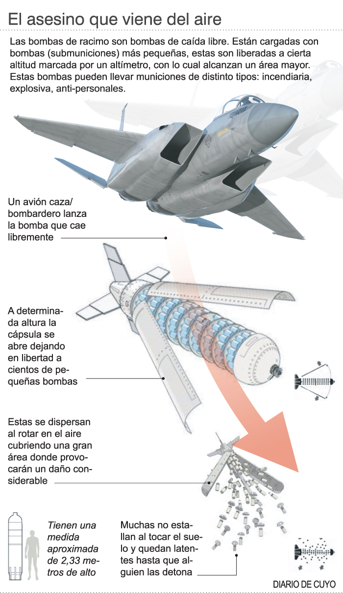 Las bombas de racimo detonan en el aire y liberan cientos de submuniciones en un amplio radio de entre 200 y 400 metros. Su riesgo también está vinculado a que algunas de estas minibombas no detonan y se quedan enterradas, con una tasa de fallo de entre 5% y 30%, por lo que gran número de víctimas colaterales son niños y niñas, que se ven atraídos a ellas por su forma llamativa de pelota de tenis.