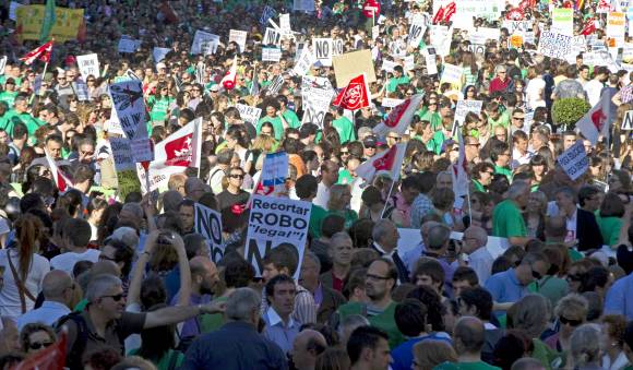 Cientos de miles de personas rechazaron ayer en las calles de España el “tijeretazo” al sector público educativo aprobado por el gobierno de Mariano Rajoy, en el marco de una jornada de huelga histórica en todos los niveles de la enseñanza. La manifestación fue en rechazo a un “brutal” recorte al presupuesto del sector, que ronda el 30%, adoptado por el Ejecutivo central y los gobiernos regionales, en aras de reducir el elevado déficit público. Las centrales sindicales aseguraron que el paro tuvo el 80% de adhesión, en cambio, el Ministerio de Educación español cifró en un 19,40% el nivel de adhesión a la huelga.