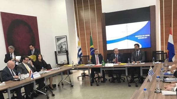 El ministro de Relaciones Exteriores brasileño, Aloysio Nunes, publicó en Twitter una fotografía del encuentro que se desarrolla en San Pablo con el siguiente mensaje: "Reunión con Jorge Faurie, Rodolfo Nin Novoa y Eladio Loizaga para decidir sobre la suspensión de Venezuela en el Mercosur".