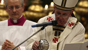 Mientas, el obispo de Roma pronunció en latín un antiguo pregón que reza "Cristo ayer y hoy, principio y fin, alfa y omega. A Él pertenece el tiempo y los siglos, a Él la gloria y el poder por los siglos de los siglos".