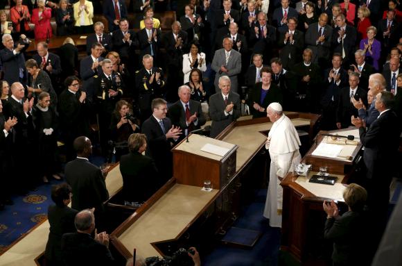 ‘Me alegra que EEUU siga siendo para muchos la tierra de los sueños’, adhirió seguido de un aplauso conjunto y de pie de todos los invitados cautivados con los 50 minutos de exposición de Francisco.