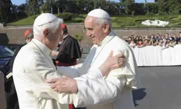 Los dos papas que conviven en la Ciudad del Vaticano, Francisco y el emérito Benedicto XVI, volvieron ayer a abrazarse públicamente durante la inauguración de una estatua del arcángel San Miguel en los jardines vaticanos.
