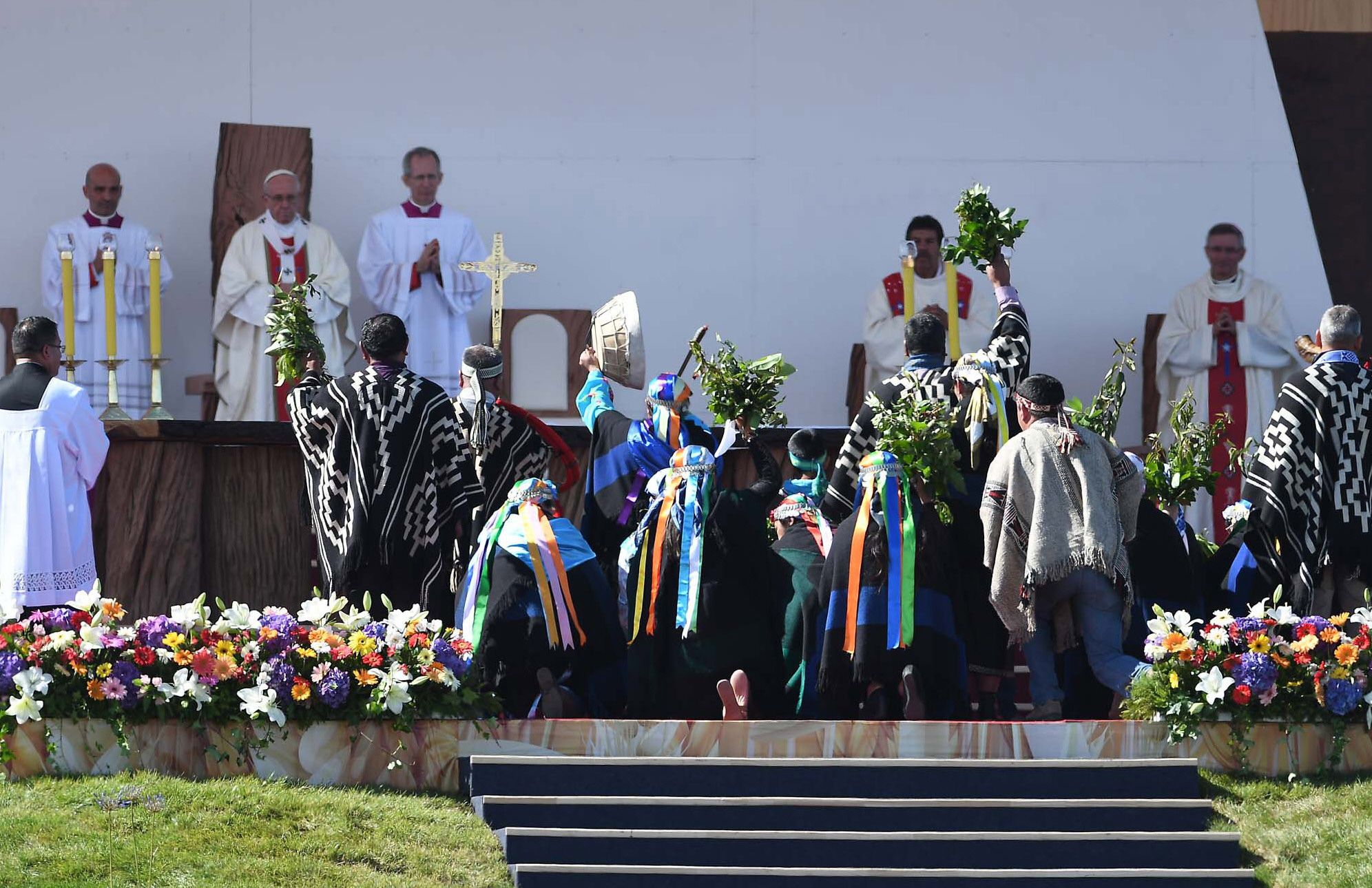 En una colorida misa frente a miles de pobladores de la Araucanía, incluidos grupos de mapuches chilenos y argentinos, el papa Francisco pidió a los integrantes de esa comunidad que digan “no a la violencia” porque “termina volviendo mentirosa la causa más justa” y los convocó a practicar una “política para la paz”.