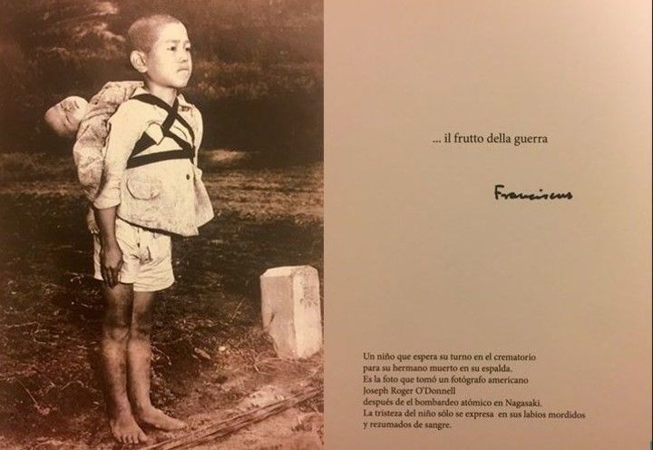 “La he encontrado por caso, es el 45 y es un niño con su hermanito muerto en la espalda esperando el turno ante el crematorio en Nagasaki después de la bomba. Me conmovió cuando la vi y solo quise escribir: el fruto de la guerra y pensé en imprimirla”, dijo. “Porque conmueve más que mil palabras”, agregó.