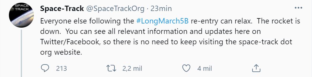 “Todos los demás que sigan el reingreso de #LongMarch5B pueden relajarse. El cohete cayó”, tuiteó.