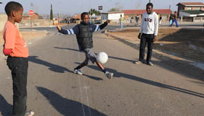 Sudáfrica, 5 de junio.- Kumula intenta arreglar una pelota pinchada mientras sus amigos observan preocupados. Lleva un buen rato tratando de inflarla y, aunque dice que es un experto en este tipo de asuntos, aún no lo ha logrado. A pocos metros, en la esquina, otro grupo de jóvenes mayores que ellos juegan un picadito en la calle.