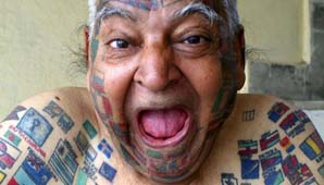Buenos Aires, 3 de agosto.- En la India, Guinness Rishi es conocido como el "hombre bandera" por poseer más de 500 enseñas nacionales tatuadas en el cuerpo, la plusmarca más llamativa de las 22 logradas por este septuagenario enamorado de los récords.