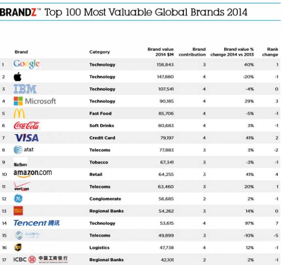 EE.UU 21 de mayo.- Según el estudio The Brandz, realizado por la prestigioso despacho de publicidad, comunicación y marketing Millward Brown, la marca Google se encuentra como la más cara del mundo, evaluándola en $158,843 millones de dólares, con un crecimiento del 40% de un año para otro destronando, del primer sitio, a la marca de la manzana mordida del gigante de Cupertino que este año perdió 20% de su valor según el estudio.